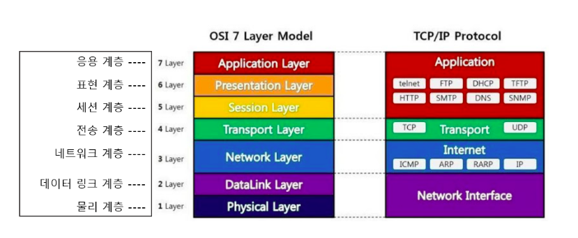 OSI 7 계층이란? 네트워크에서 통신이 일어나는 과정. 1. 물리 계층 전기적, 기계적, 기능적인 특성을 이용해서 통신 케이블로 데이터를 전송 통신 단위는 비트이며 이것은 1과 0으로 나타냄 데이터가 무엇인지, 어떤 에러가 있는지 등에는 전혀 신경 쓰지 않음. 예 ) 통신 케이블, 리피터, 허브 2. 데이터 링크 계층 물리계층을 통해 송수신되는 정보의 오류와 흐름을 관리 통신에서의 오류도 찾아주고 재전송도 하는 기능 맥 주소 통신 전송되는 단위를 프레임 예) 브리지, 스위치 ** 맥 주소 통신하기 위한 랜카드에 가지고 있는 고유 넘버, 즉 하드웨어 주소. 아이피 주소에서 맥 주소로 변경되는 과정 ARP(Address resolution protocal) https://m.blog.naver.com/wo..